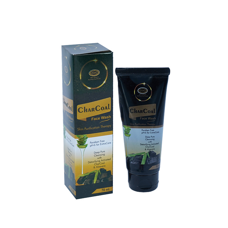 DIRECTION OF USE Moisten face, apply small quanty of face wash and gently work up lather using circular moon. wash off and Pat dry . BENEFITS Charocoal face wash evaculates excessive oil and purifies skin. It wipes out bacteria, dirt, impuries, toxins caused due to excessive exposure of polluon. It helps in opening up the clogged pores and removing whiteheads COMPOSITION Activated Charcoal 2.00% Aloevera (Aloe barbadensis) 3.00% Haldi Ext. (Curcuma longa) 2.00% Tulsi Ext. (Ocimum sanctum) 2.00% Neem Ext. (Azadirecta indica) 2.00% Papaya Ext. (Carica papaya) 2.00% Base Q.s